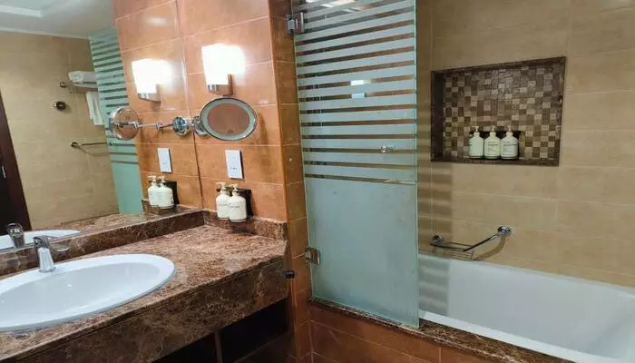 - امکانات حمام و سرویس بهداشتی: دستمال توالت، حوله، بیده، وان یا دوش، دمپایی، حمام اختصاصی، توالت، لوازم بهداشتی رایگان، حوله تنپوش، سشوار، وان، دوش.