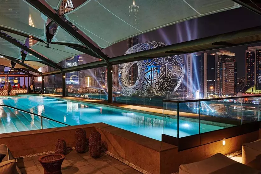 • استخر: روباز، رایگان، استخر در پشت‌بام، استخر کم‌عمق و عمیق، با چشم‌انداز موزه آینده، بار کنار استخر، صندلی و چتر ساحلی