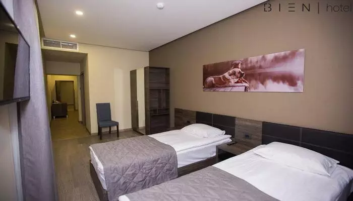 هتل بین ایروان (Bien hotel Yerevan) در منطقهای آرام واقع شده است که به جاذبههای گردشگری بسیاری نیز دسترسی دارد. این هتل، یک اقامتگاه مدرن، شیک و مینمالیست سه ستاره است که کارکنان مهماننوازی دارد. ممعاری هتل ظریف و مدرن است که در پسزمینه ساختمانهای شهر ایروان، به چشم میآید. وقتی پا روی سنگفرشها میگذارید، با دو ردیف درختان مواجه میشوید که در انتهای آنها، بنای زیبای هتل به چشم میخورد. همه 26 اتاق هتل رو به این حیاط و باغ پردرخت هتل هستند. میتوانید هر روز با دیدن این منظره، از خواب برخیزید و برای تنفس در هوای آزاد به بالکن بروید. همه اتاقها به امکاناتی مانند صندوق امانات، مینیبار، سشوار و تلویزیون مجهز هستند. برای کسانی که میخواهند بعد از یک روز گشتوگذار در ایروان کمی استراحت کنند، استخری فصلی در فضای باز در نظر گرفته شده است که چشمانداز به فضای سبز دارد و در اطراف آن صندلی و چتر ساحلی قرار گرفته است. در این هتل یک مرکز تناسب اندام کوچک و مجهز است که استفاده از آن برای فعال ماندن در طول سفر پیشنهاد میشود. مهمانانی که با ماشین سفر میکنند، خیالشان راحت باشد؛ زیرا پارکینگ رایگانی در داخل هتل قرار گرفته و کارکنانی برای پارک ماشین در نظر گرفته شدهاند. شما میتوانید روز خود را با بوفه صبحانه مانند غذاهای محلی ارمنی و اروپایی شروع کنید. موقعیت هتل بین در شهر ایروانی نسبتاً مناسب است و از جاذبههایی مانند موزه نسلکشی ارامنه و موزه سرگئی پاراجانف فاصله چندانی ندارد. فرودگاه بینالمللی زوارتنوتس فقط هشت کیلومتر با هتل بین ایروان فاصله دارد.